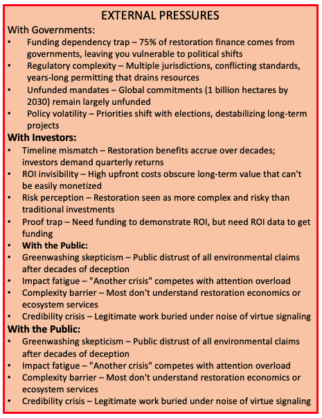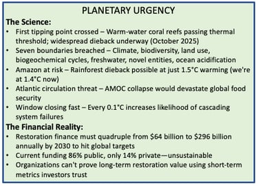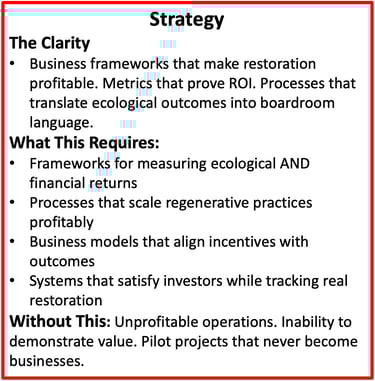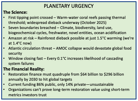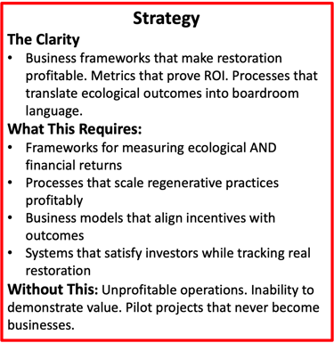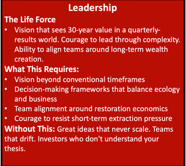 The brutal truth: Planetary systems are collapsing faster than traditional business models can adapt. These aren't three separate problems. They're one integrated crisis requiring three interlocking solutions: Leadership Intelligence + Business Frameworks + AI-Powered Operations Most consultants offer one of these. You need someone who's built all three—for 30 years—and understands the natural capital economics that make restoration profitable at scale.